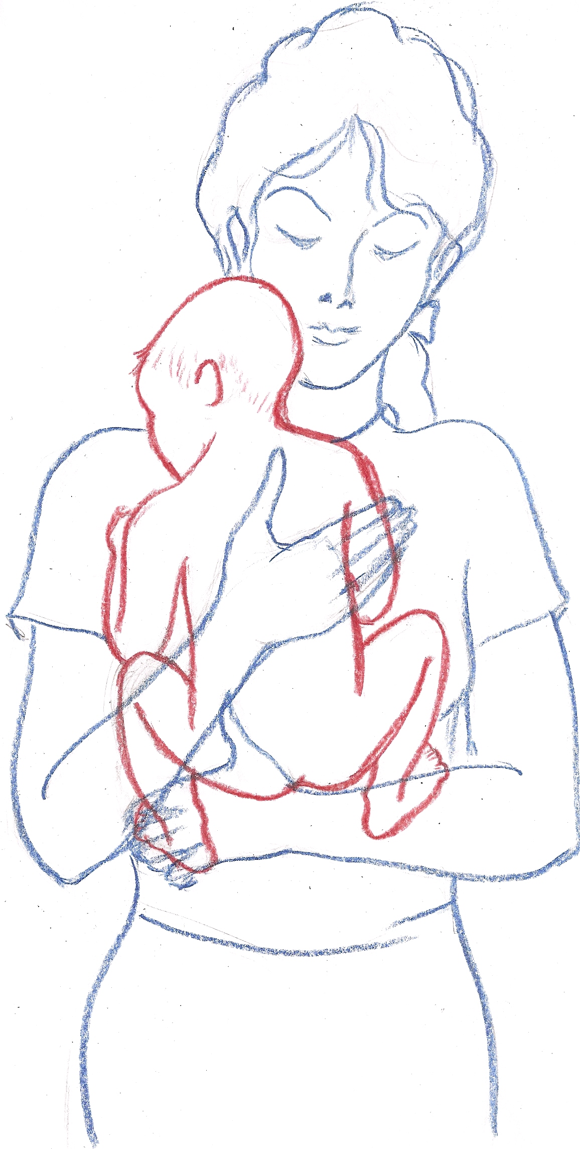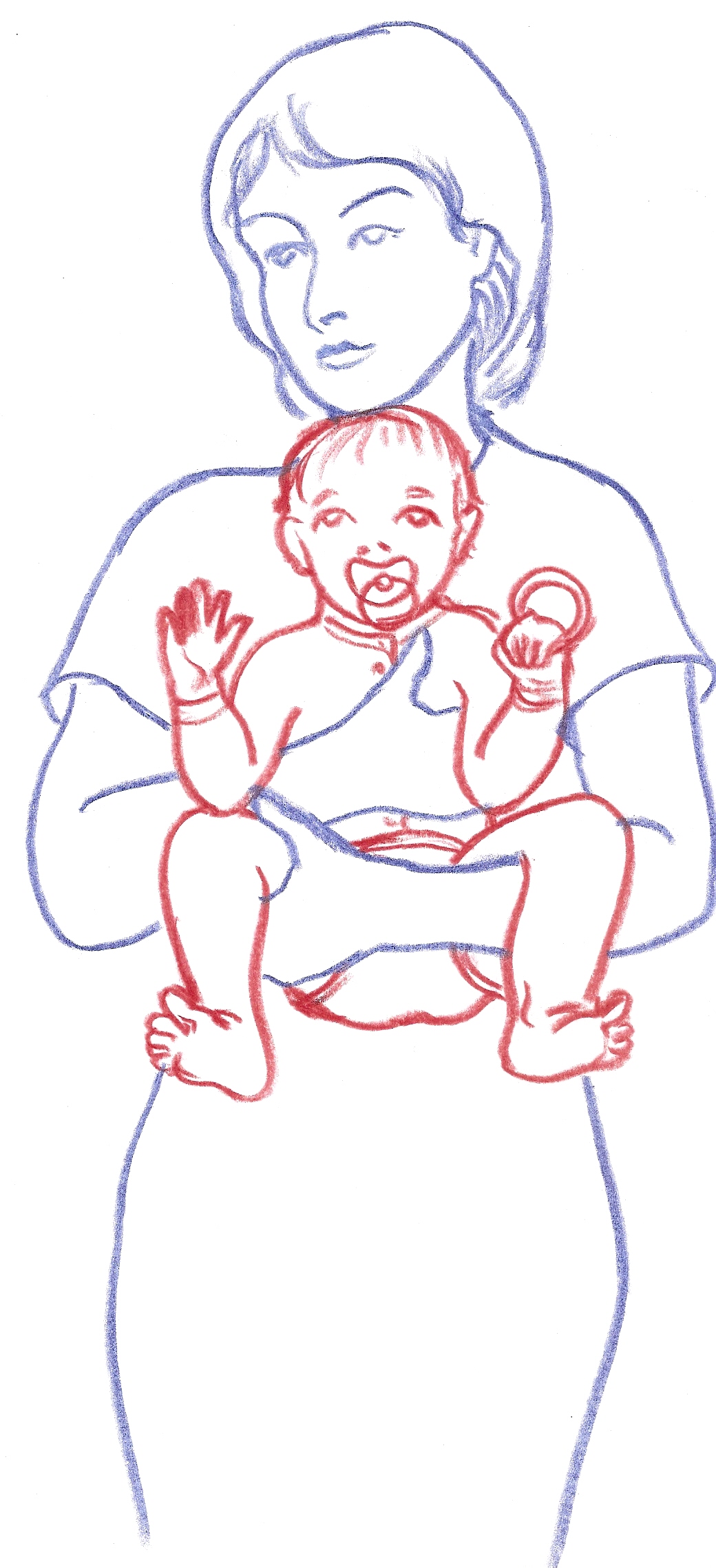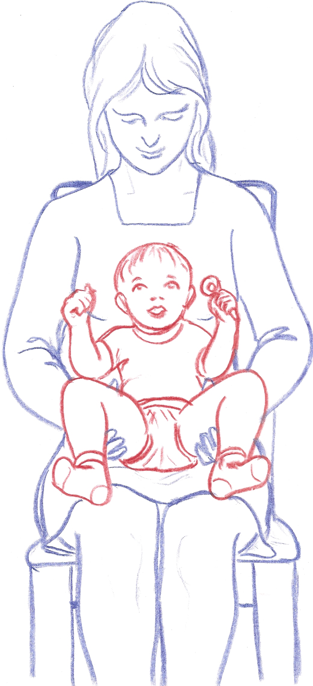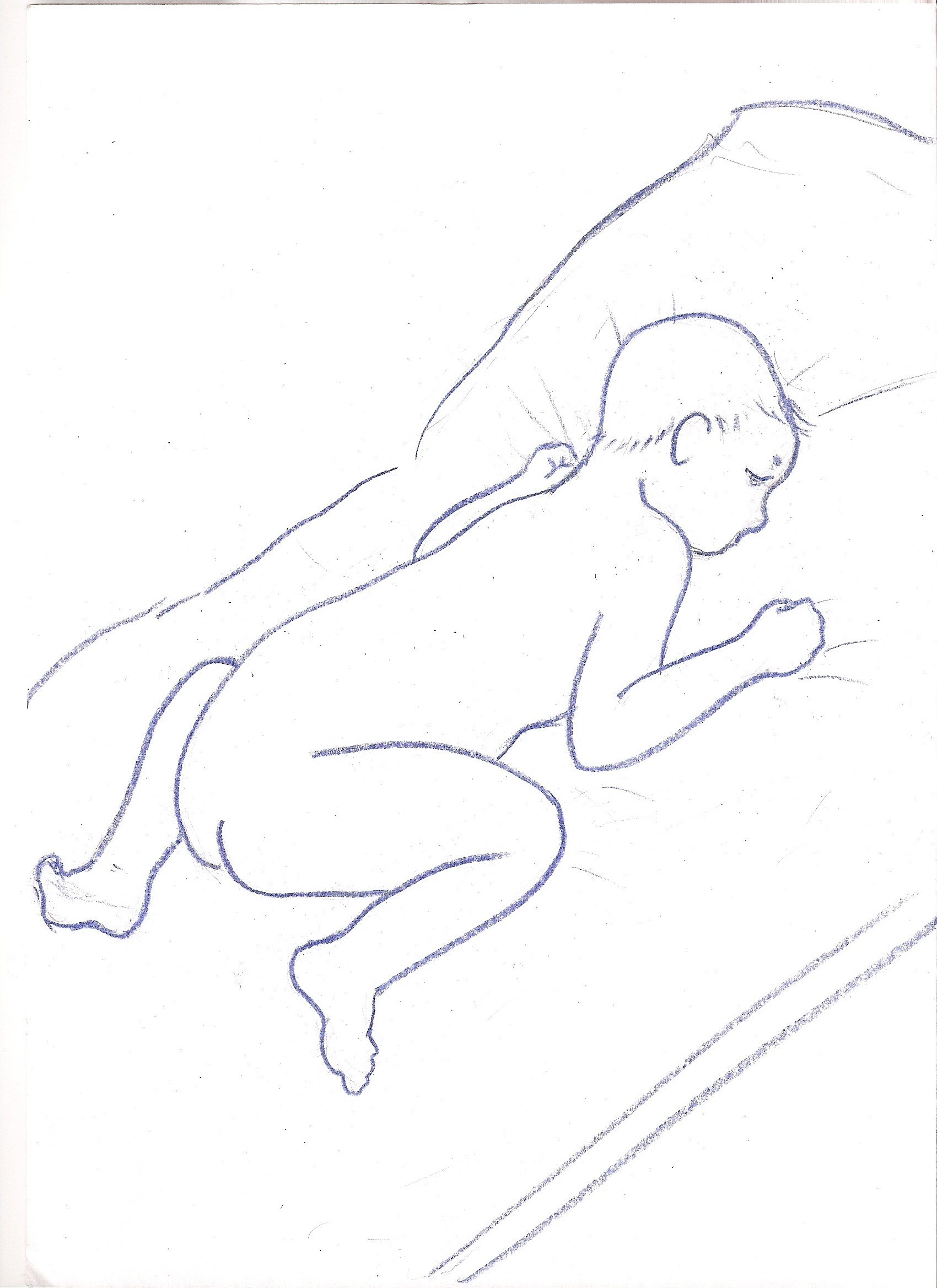trzymamy dziecko za podudzie nogi po stronie gdzie jest problem z biodrem ,kolana zgięte symetrycznie okolo 90stopni ,pośladki przewieszone za przedramię,druga reka podtrzymuje głowę, tak samo trzymamy i układamy dziecko na sobie w pozycji leżącej,najlepiej żeby spało tak na kimś