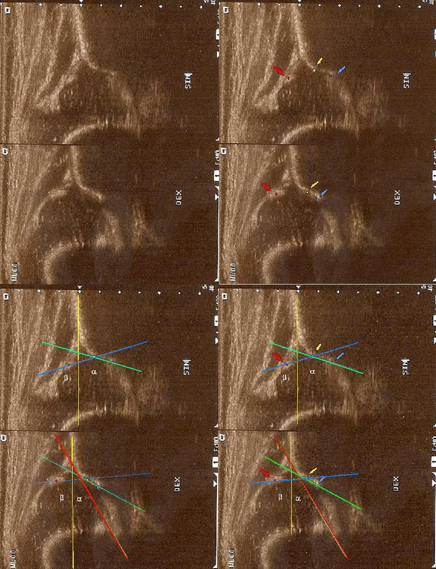Typ D(kąt jak Typ IIa)   typ IIA (kąt  I) dziecko 3 tygodniowe   pomiar  katów @ i B przez program w aparacie usg