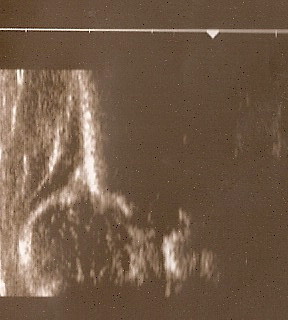 - 2 gałąź dolną kości biodrowej jako jasne,dobrze zaznaczone,silne echo