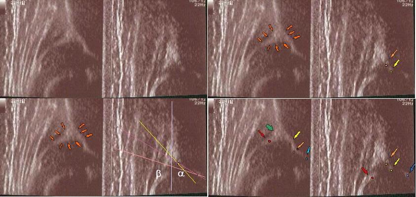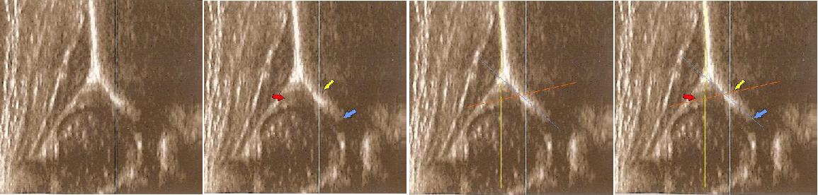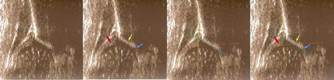 linii podstawnej ( żółta)równolegle do sylwetki kości biodrowej po zewnetrznej stronie prze punkt gdzie ochrzęstne przechodzi w okostna i styka sie z echem kości : w przypadku wysuwania głowy z panewki nie zawsze jest to już pozycja standardowa; sylwetka kosći biodrowej pochyla sie i powiniśmy kreślic linie zgodnie z odchyleniem w lewo druga żółta liinia kropkowana ( trzeba o tym pamiętac bo z D wykreślimy I prawidłowy kąt @ o wartości 62 st .I jest to najczęstszy błąd; u kikutygodniowych niemowląt kiedy zmiany wtórne nie sa jeszcze wykształcone; o poważnych konsekwencjach zwłaszcza jeśli korzystamy z programów do automatycznego wykreslania kątów )